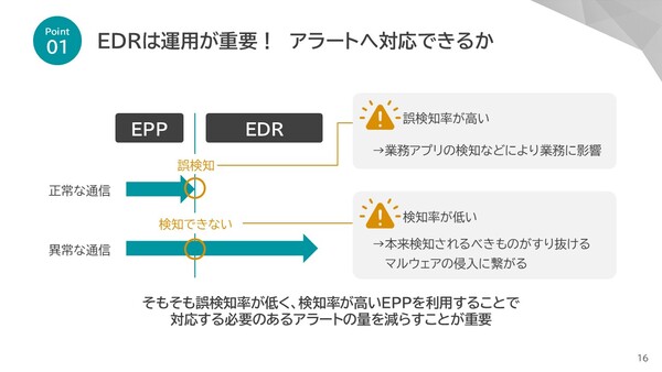 EDRは、エンドポイントにおける不審な挙動を検知し、迅速な対応を促す製品であるが、導入しただけではセキュリティレベルは向上しない。EDRがアラートを発生させた際に、適切な対応を実施できるかが重要だ。EDRがアラートを発生させるのは、ウイルス対策ソフトで検知できなかったマルウェアが侵入したケースである。そのため、ウイルス対策ソフトの検知率が低いと、本来検知すべきものがすり抜け、結果としてEDRのアラートが大量に発生してしまう。また、正常のアプリケーションや通信まで誤検知してしまうような精度の低いウイルス対策ソフトでは意味がない。誤検知率が低く、検知率が高いウイルス対策ソフトを利用し、EDRが発生させるアラート量を減らす必要がある(図5)。