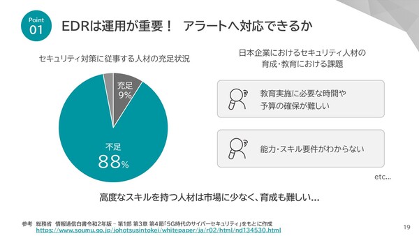 アラート対応に求められるスキルは大きく3つに分けられる。攻撃手法に関するセキュリティ知識、システムやネットワークに対する理解、そして、脅威ハンティングやフォレンジックのスキル・経験だ。EDRの効果を最大限に発揮させるためにも、運用者のスキルは重要となるのだ。