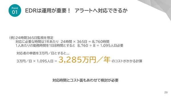 EDR/MDRを選定する際には、アラートに対して適切に対応できる運用体制を構築できるかが重要な観点となる。また、製品やサポートが日本語に対応しているか、既存のネットワークや端末、サーバーに影響を及ぼさないか、といった点も押さえておく必要がある。