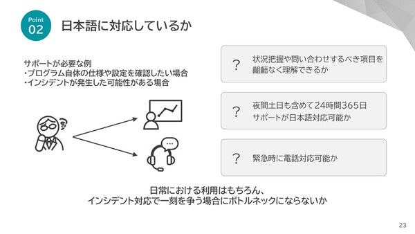 EDRを自社で運用する場合でも、MDRを利用する場合でも、製品のインターフェイスやサポート窓口が日本語対応しているかどうかは、製品選定時に重要な要素となる。インシデント発生時にサポート窓口と円滑に意思疎通できるのは大きなメリットだ。緊急時や非常時に状況を適切に把握できず、サポートと連携できない事態は避けなければならない。
