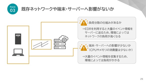 EDRは、端末で発生したイベントを大量にサーバーへ送信するため、環境によってはネットワーク負荷が高まる。また、端末によっては大量のイベント情報の収集が発生することでCPUやメモリーの消費量が増加し、動作が遅くなる場合がある。既存の端末やサーバーへの影響も、EDR選定時に注意すべきポイントだ(図9)。