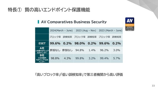 また、ESET PROTECT MDRのエンドポイント保護機能は検知率が高く、誤検知率が低いことで、第三者機関からも高い評価を得ている。ユーザーの運用を妨げる頻度が少ないため、担当者は万が一の対応に集中できるのが利点だと言える(図13)。