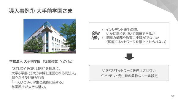 大手前学園では、インシデント発生時にいかに早く検知し隔離できるか、そして、学校運営業務や教育に支障をきたさないか、という2つの課題を抱えていた。インシデント発生時に即座にネットワークを停止するという方法も検討されたが、運営業務や教育現場に影響を与えないよう採用に至らなかった。しかし、ESET PROTECT MDRでは即時停止ではなく、柔軟な対応が可能である点が評価され、導入されたという経緯がある(図14)。