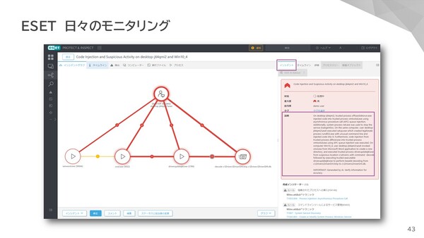 インシデントの可能性がある場合には、専用のインシデント画面で各プロセスのつながりが可視化され、調査を容易にしている(図18)。