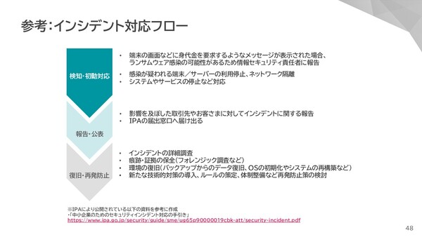 万が一、情報流出などの被害が発生した場合には、初動対応に加え、報告、公表、復旧、再発防止を実施する。取引先や顧客に影響を与える場合にはインシデント報告を行わなければならない。また、ウイルス感染による被害が生じた場合には、所管省庁への報告やIPAへの届け出が必要である。調査と証拠保全を終えた後、復旧作業を実施する。ランサムウェア対策では、日常的に適切なバックアップを取得しておくことが重要である。さらに、再発防止策として新たなルールの策定、ツール導入、体制見直しなどを実施する(図20)。