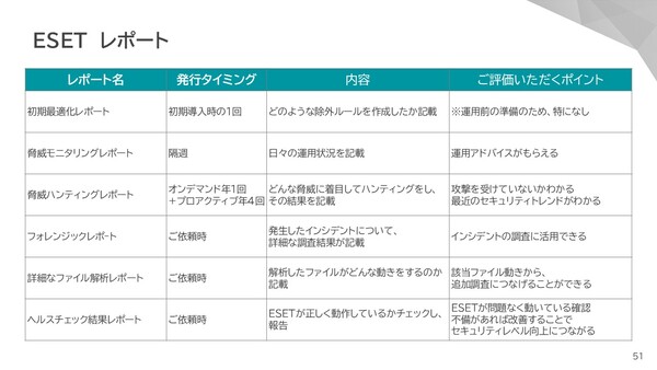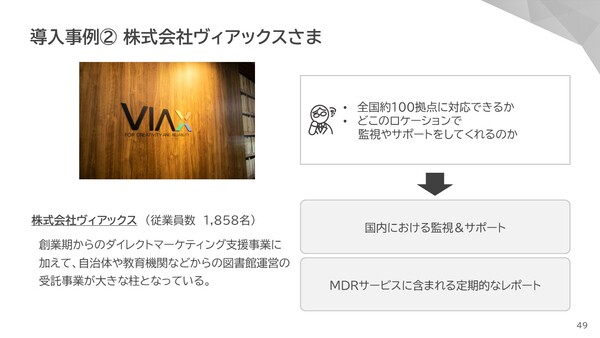 ヴィアックス社がMDR導入を前に抱えていた懸念は大きく2点あり、全国約100拠点に対応できるか、どのロケーションで監視やサポートが行われるのか、というものであった。ESET製品は国内で監視とサポートを提供しており、さらにMDRサービスに含まれる定期的なレポートが評価され、導入に至った(図21)。