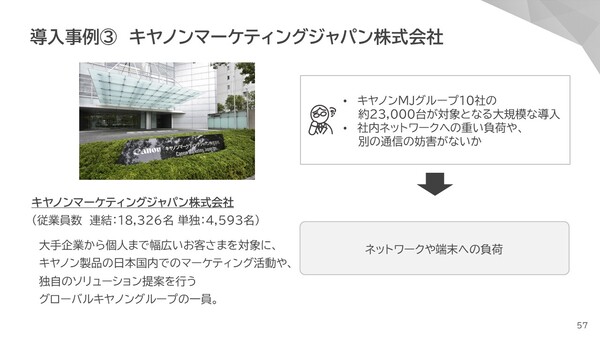 キヤノンMJグループ10社における大規模なEDR導入を検討する際、社内ネットワークへの負荷や、他通信への影響が懸念されていた。ESET製品の動作検証を行った結果、ネットワークや端末への負荷が軽微であることが確認され、導入に至った(図23)。
