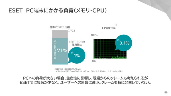 動作検証では、通常時のネットワークへの負荷は非常に軽く、端末への負荷も少ないことが確認された。また、障害発生を想定したテストでも、ネットワークや端末への影響は限定的であった。実際に、平均メモリー使用率71%のうち、ESETによる使用率は1%にとどまった。CPU使用率も0.1%と極めて低く、ユーザーへの影響は極めて小さかった。また、端末への負荷に関する利用者からのクレーム等も発生しなかった(図24)。