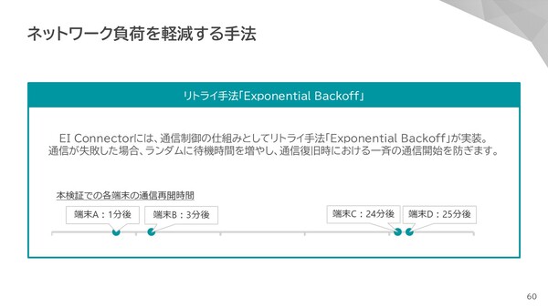 通信障害を想定したテストにおいてネットワーク負荷が限定的であった理由は、通信が失敗した場合に、エラーごとに待機時間をランダムに増加させる機能が実装されているためである。この仕組みによって、復旧時に一斉通信が発生するのを防いでいる。通常時だけでなく、障害時や復旧時も考慮して設計されている点がESET製品の特長である(図25)。