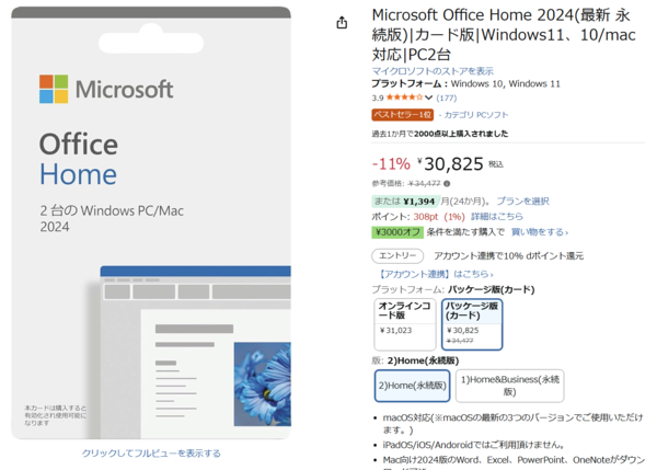 Microsoft Office Home 2024(永続版)カード版が、Amazon.co.jpでセール中です。参考価格34,477円のところ、11%オフの30,825円という魅力的な価格となっています。