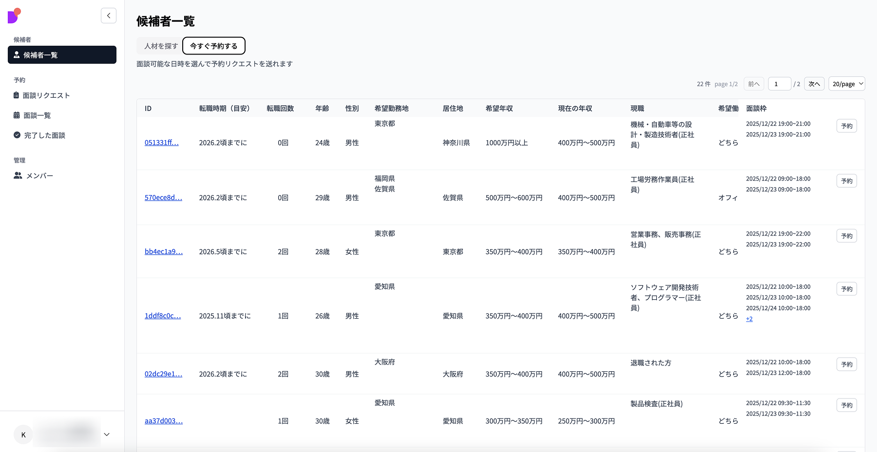 デイトラスカウトの管理画面。候補者情報を一元管理し、効率的なマッチングを実現します。
