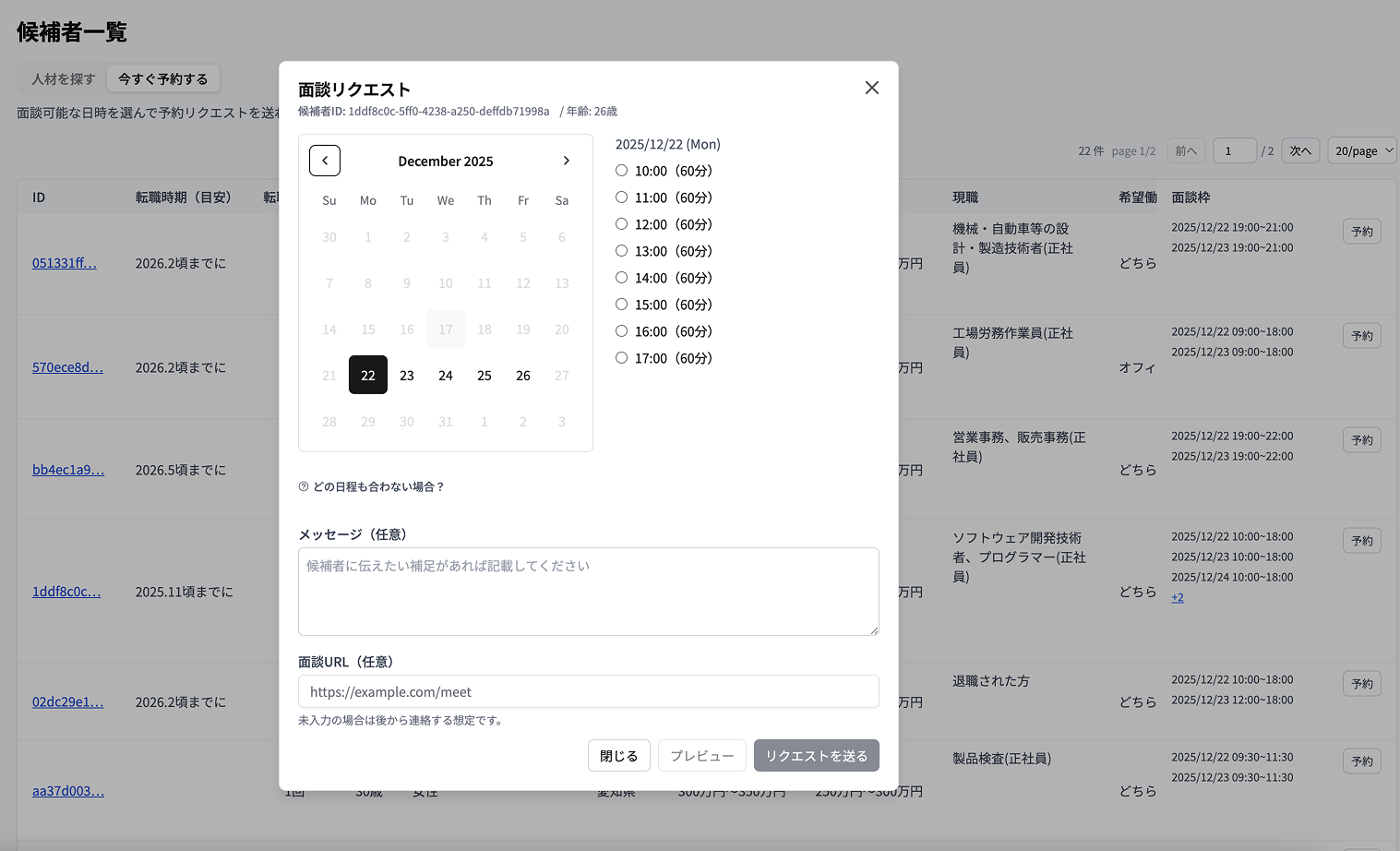 面談可能枠を既に設定している候補者には、システムからすぐに面談リクエスト可能です。候補者の都合の良い時間帯を選んで、ZoomやGoogle Meetのリンクを添えてスムーズに面談を設定できます。