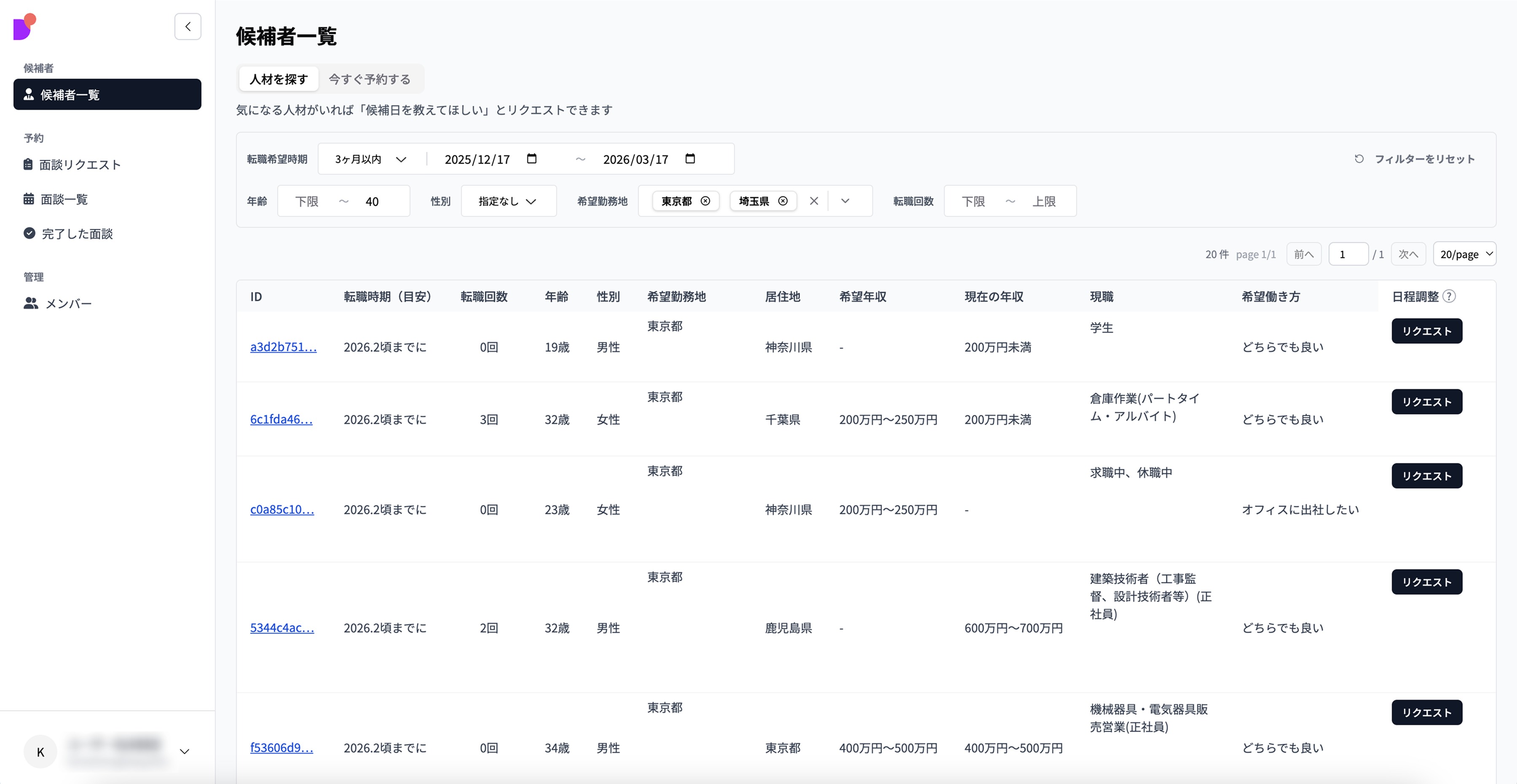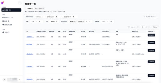 希望勤務地、年齢、転職回数などの条件で候補者を絞り込み検索できる専用CRM画面