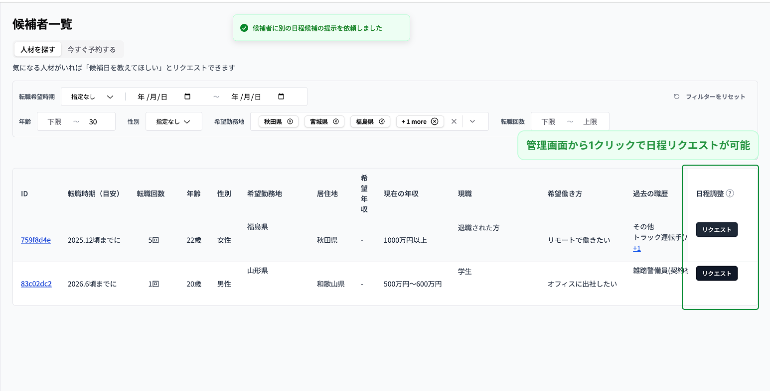 面談可能枠を設定していない候補者でも、「この人材を支援したい」と思えば、日程調整のオファーを送ることができます。候補者の状況に合わせた柔軟なアプローチが可能です。