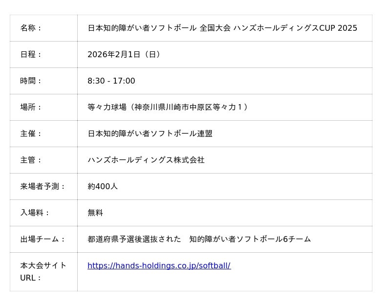ハンズホールディングス株式会社(本社:東京都千代田区、代表取締役社長兼グループCEO:徳村有聡 以下当社)は、2026年2月1日(日)に等々力球場(神奈川県川崎市)にて日本知的障がい者ソフトボール大会「ハンズホールディングスCUP」初の全国大会を開催いたします。本大会スペシャルゲストとして、元横綱白鵬・元大関把瑠都氏の来場が決定しました。さらに五輪メダリストによる選手への特別指導が実施されると共に、選手の投球を肌で感じられる特別体験イベントも行います。また本大会の成功および次なる目標である国際大会の開催を見据え、大会運営支援を募るクラウドファンディングが、2025年11月25日(火)より開始いたしました。