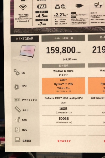 16型の液晶ディスプレーは、画面解像度がWUXGA(1920×1200ドット)で、sRGBカバー率100%、リフレッシュレートは165Hzに対応します。システムメモリーは16GB(8GB×2、DDR5)、ストレージは500GBのM.2 NVMe SSD(Gen4)を採用。無線通信はWi-Fi 7に対応し、バッテリーの駆動時間は約4.5時間です。