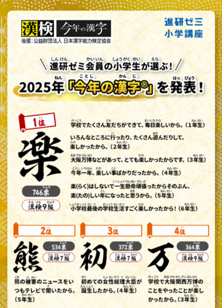 「今年の漢字」の1位に選ばれたのは「楽」となった。理由としては「学校でたくさん友だちができて、毎日楽しいから」(小学1年生)、「今年一年、楽しい事ばかりだったから」(小学4年生)といった理由が挙げられていた。