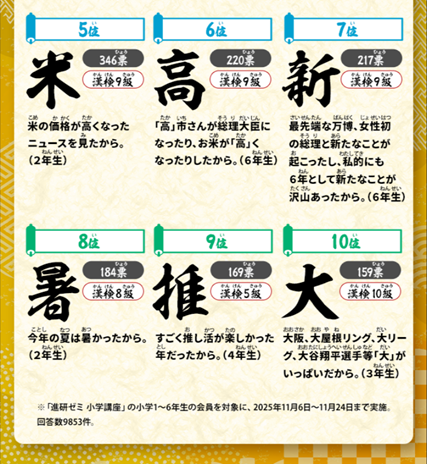 企画に関連して別途募集した「小学生の最も印象に残ったニュース」では「初の女性総理大臣誕生」が最多となり、これと漢字「初」の選出が示すように、2025年は小学生にとっても多くの初めての体験や出来事があった年であることが浮かび上がった。