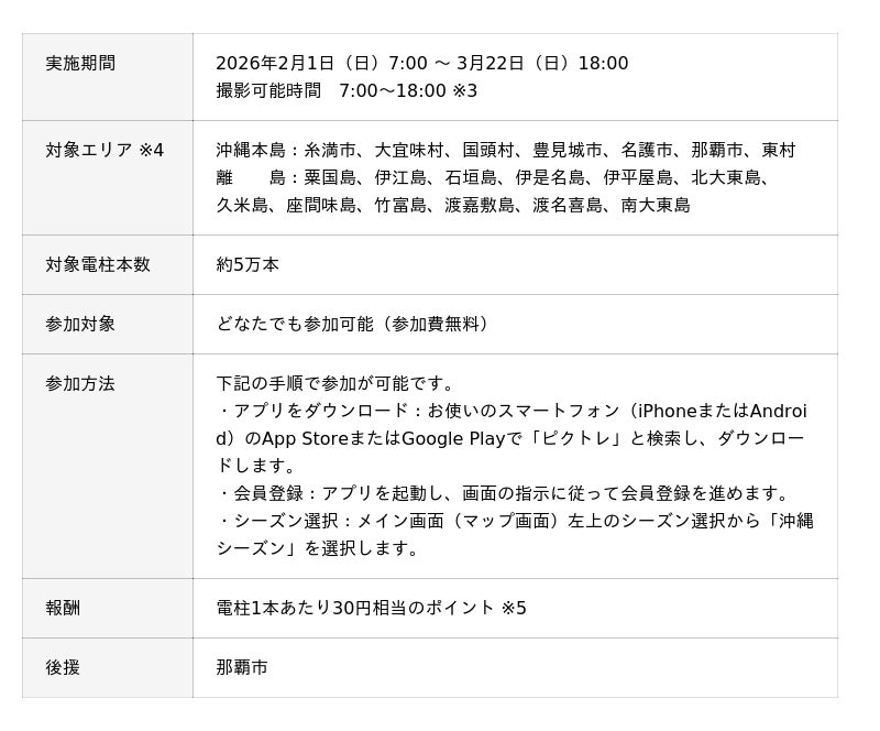Digital Entertainment Asset Pte. Ltd.(本社:シンガポール、Founder & CEO:吉田 直人、Founder & Co-CEO:山田 耕三、以下「DEA」)は、市民参加型社会貢献ゲーム「PicTree(ピクトレ)」を開発し、運営するGrowth Ring Grid Pte. Ltd.(本社:シンガポール、CEO:福田 史、Co-CEO:鬼頭 和希、以下「GRG」)とともに、沖縄電力株式会社(本社:沖縄県浦添市、代表取締役社長:本永 浩之、以下「沖縄電力」)とNTT西日本株式会社 沖縄支店(本社:大阪府大阪市、支店長:古堅 誠、以下「NTT西日本」)ならびに株式会社NTTフィールドテクノ(本社:大阪府大阪市、代表取締役社長:桂 一詞、以下「NTT-FT」)の共同点検 ※1に向けた実証実験として、市民参加イベントとなる「ぼくとわたしの電柱合戦in沖縄」を実施することをお知らせします。開催期間は2026年2月1日(日)~3月22日(日)の約2ヶ月間です。