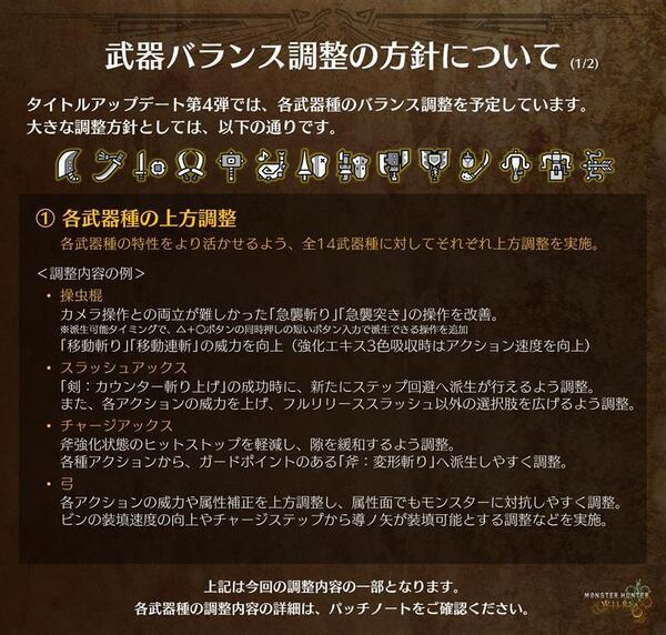 今回、14武器種すべてにバランス調整が入る。基本的には上方調整となっているので心配いらないとは思うが、新たにできることが増えていたりするので、自分の使う武器種だけでも調整内容を確認しておくと良い。