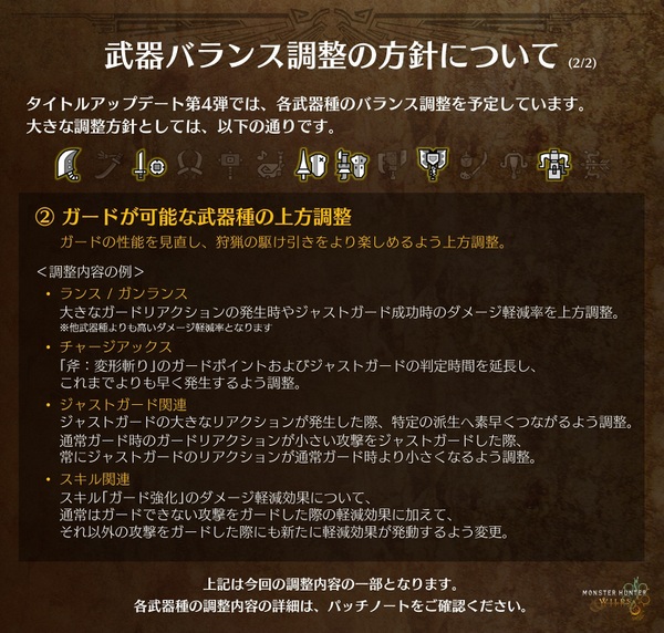 また、防具の強化システムが拡張され、上位防具の強化限界が引き上げられる。防御力だけでなく装飾品スロットも増えるので、よりスキルを発揮しやすくなるという寸法だ。アップデート後はぜひ防具を強化し、より倒れにくい不屈の防御力を手に入れよう(鎧玉も手に入りやすくする調整あり)。