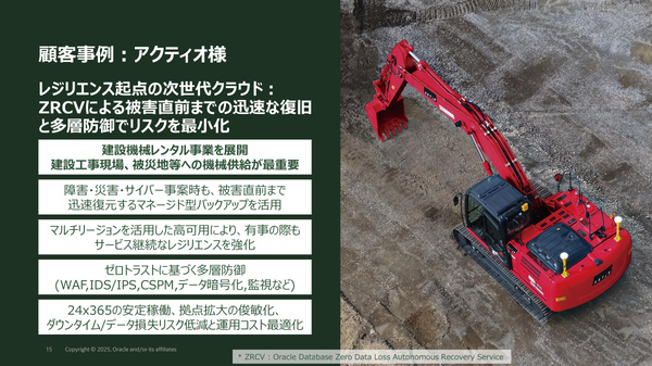 また、低コストからデータ保護を始められる特徴から、すでに多くの国内企業がZRCVを利用しているという。その一例として紹介された建機レンタルのアクティオは、大規模災害の発生時にも必要とされるビジネスであることから、OCIの東京リージョンとシンガポールリージョンを活用してBCP/DR対策を行ったうえで、障害直前までのデータを迅速に復元できるZRCVを採用しているという。