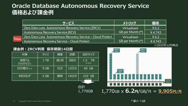 ZRCVの利用価格は、バックアップデータとREDOログの保存容量に応じた従量制となっており、1GBあたり月額6.2円(税抜)。一例として大澤氏は、更新頻度の多くない1TBのDBを保護対象とした場合の試算では、月額1万円を切る料金からZRCVによるデータ保護が始められると述べた。