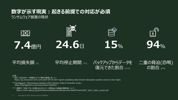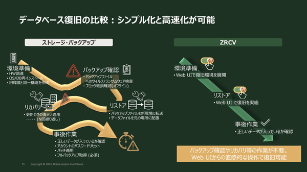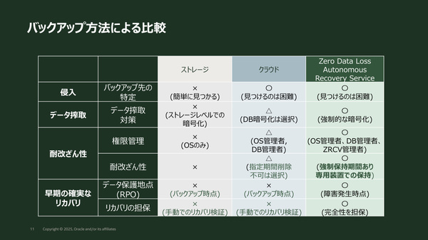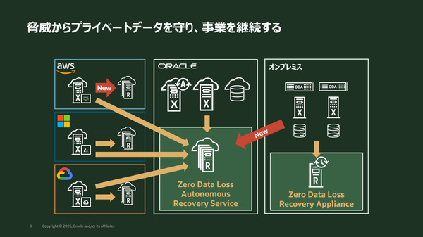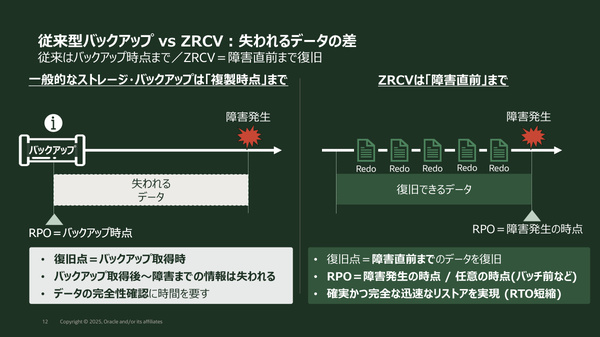 日本オラクルは2025年12月11日、データレジリエンス(重要データの回復性)をテーマとした説明会を開催した。Oracle Database向けのバックアップソリューション「Zero Data Loss Autonomous Recovery Service(以下、ZRCV)」を取り上げ、RPO(目標復旧時点)の最小化や迅速な復旧を可能にするその仕組みや、ランサムウェアへの耐性も含めた従来のバックアップ手法との違いなどを紹介した。