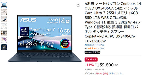 ASUSの人気ノートPC「Zenbook 14 OLED UX3405CA」が、Amazonタイムセールに登場しました。過去価格179,800円のところ、11%オフの159,800円で販売中です。