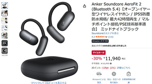 【Amazonタイムセール】Anker Soundcore AeroFit 2(オープンイヤー型ワイヤレスイヤホン)登場!