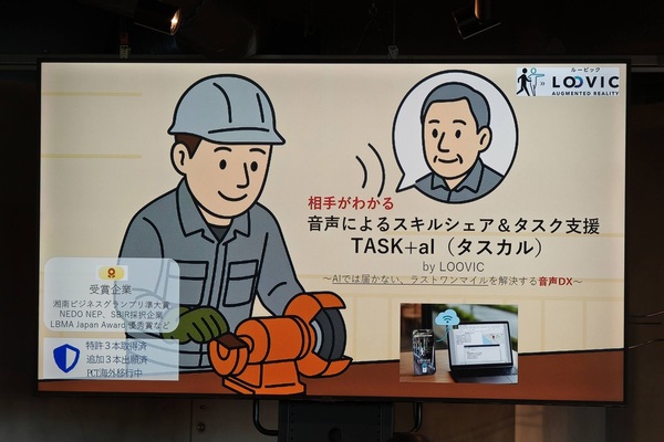 LOOVIC株式会社は、現場で教える人が発する15秒程度の音声を録音し、そのまま無人で作業者に伴走支援できる「タスク支援」ナビガイドを提供。AIがタグ付けできない「ここ」、「あれ」といった曖昧な指示も簡単に記録、共有できる特許技術が強みだ。大手がアプローチしづらい中小零細企業の現場の属人化解消と、技能継承・教育時に発生する伴走支援人件費の削減を目指している。