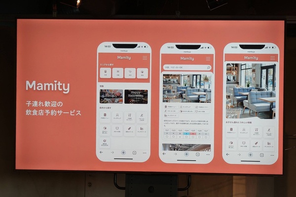 石岡美羽氏は、6歳までの子どもを持つ家族向けに、子連れ歓迎の飲食店を検索、予約できるサービス「Mamity」を提案。キッズチェアの有無、ベビーカー入店可否、授乳室の有無など、既存予約サイトでは拾いきれない、子連れに本当に必要な情報を一元化し、外食時のストレスの低減を目指す。将来的には、保育や地域コミュニティとの連携も視野に入れているとのこと。