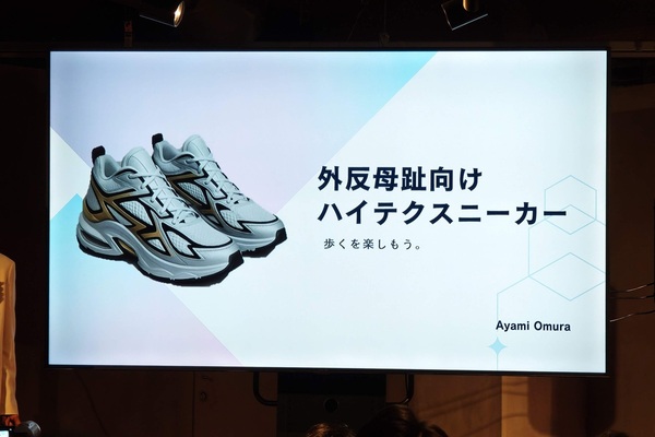 大村彩美氏は、 日本人女性の3人にひとりが悩む外反母趾の解決を目指し、ハイテクスニーカー「smileee sneakers」を提案。内部をサンダル構造とすることで外反母趾への負担を軽減し、足型計測アプリと3Dプリンターによるオーダーメイドインソールを組み合わせて製造する。ハイテクスニーカーというトレンド性が競合優位性につながるとアピールした。