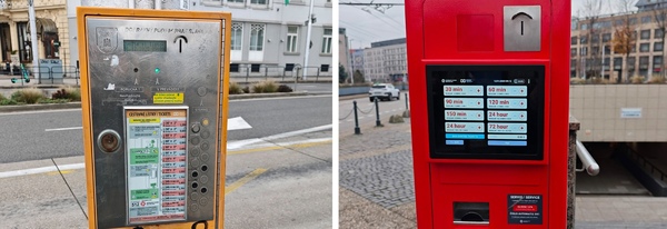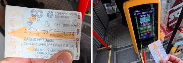 次の目的地はブラチスラバ城です。ここでのGeminiのアドバイスは「大統領官邸からお城までは上り坂が続くため、公共交通機関(トロリーバス)を使って体力を温存しましょう」というもの。さすが体力温存コース。指示通りバス停で44番か47番のバスを待ちます。バス停には黄色い券売機と赤い券売機があるのですが、黄色い方はコイン専用。対して赤い券売機はクレジットカードのタッチ決済に対応していました。小銭を持っていなくても、スマホやカードのタッチで30分券(約1.2ユーロ)がサクッと買えるのは助かります。