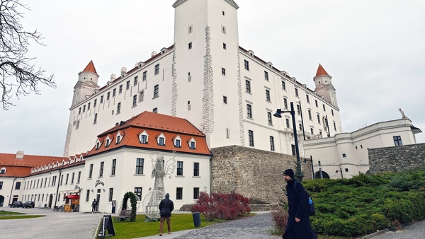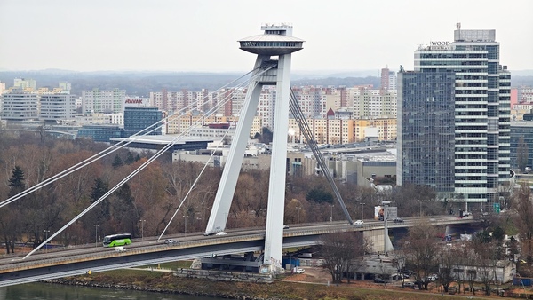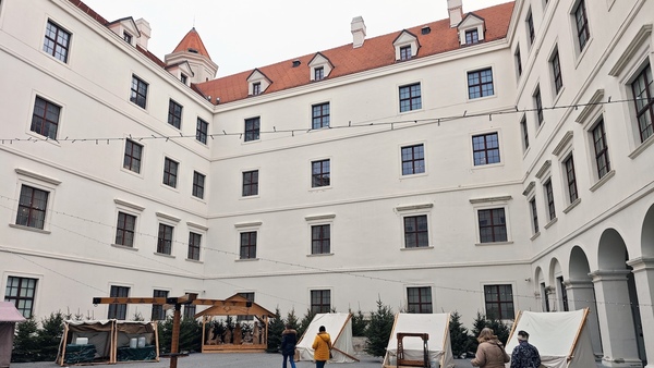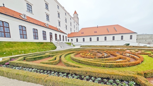 バスに揺られること約5分、お城の近くで下車して少し歩くと、ブラチスラバ城に到着しました。四隅に塔がある形状から「ひっくり返したテーブル」と呼ばれています。 城の高台からは、ドナウ川にかかる「UFOの塔」と呼ばれる展望台付きの橋や、その奥に広がるオーストリア国境付近まで見渡せます。城の裏手にある幾何学模様の庭園も美しく、冬ならではの凛とした空気を楽しめました。