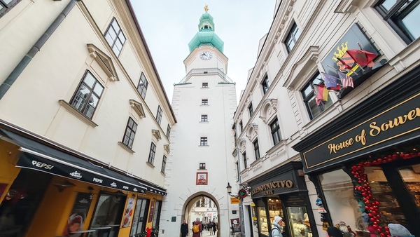 大聖堂を後にし、旧市街の入り口である「ミハエル門」を目指します。ここをくぐると、いよいよメインストリート。歩行者天国になっており、観光客で賑わっています。