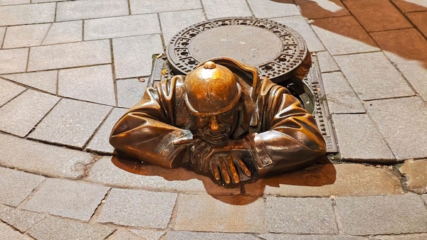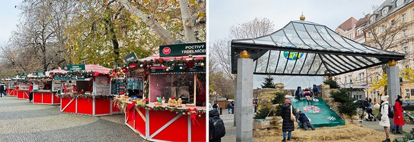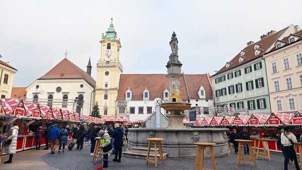 広場の近くには、マンホールからおじさんが顔を出しているユニークな銅像「チュミル像(Man at Work)」もあり、多くの人が記念撮影をしていました。さらに歩いて5分くらいの場所にある、「Hviezdoslavovo Námestie(市立公園)」へ移動。ここは通りのようになっている公園で、こちらもクリスマスマーケットの会場です。老若男女が食事や買い物、そして滑り台などで楽しそうに過ごしているのが見られ、Geminiが教えてくれたとおり、この時期の街歩きは最高です。
