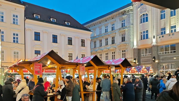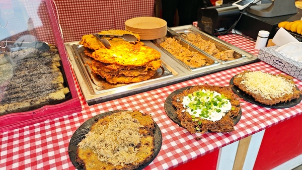 街中に降りてくると、建物で風があまりないため、そこまで寒くありません。そのため、ゆっくり歩いて回れることができ、時間的にはGeminiの案内どおりのタイミングに「フラヴネー広場(中央広場)」に到着。ここはクリスマスマーケットのメイン会場で、大きなツリーの下には数々の屋台が並び、揚げたジャガイモ料理「ロクシェ」などのローカルフードが売られています。