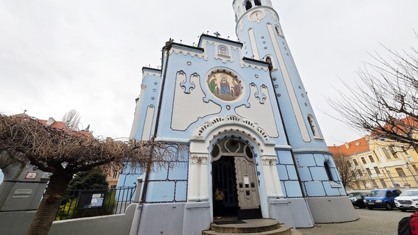 少し時間が余ったので、Geminiが「歩くのが早ければおすすめ」として提案してくれた「聖アルジュベタ教会」、通称「青の教会」へ足を伸ばしてみることにしました。旧市街から10分ほど歩くと、外観はベビーブルー一色。アール・ヌーヴォー様式で設計されたメルヘンチックな建物が現れます。残念ながら閉まっていて中には入れませんでしたが、ガラス越しに覗くと椅子まで水色で統一されており、非常に幻想的でした。