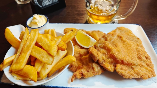 オーダーしたのは、これまたGeminiおすすめの「ウィンナー・シュニッツェル」。そしてもちろん、自家醸造のビールです。運ばれてきたシュニッツェルは薄く叩いた豚肉のカツレツですが、これが驚くほど美味。衣はサクサク、肉はジューシーで旨味があり、今まで食べたシュニッツェルの中で一番かもしれません。