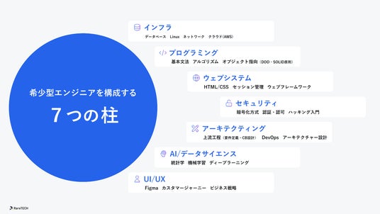 RareTECHではエンジニアに最低限必要な基礎知識を7つに分類。チーム開発や企業での開発手法なども学べます。