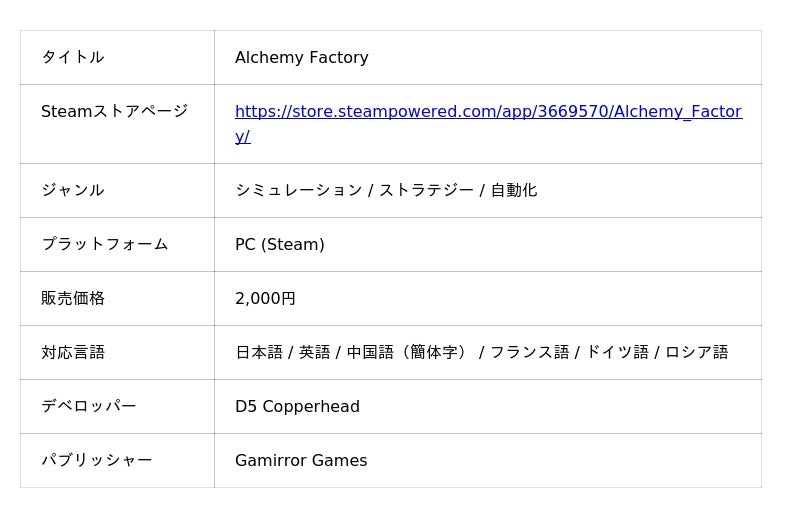 D5 Copperhead Studioが開発、Gamirror Gamesがパブリッシングを手掛ける、中世を舞台とした自動化生産ゲーム『Alchemy Factory』が、Steamにて早期アクセス版がリリースされました。価格は2,000円で、リリース後2週間はリリース記念として10%オフの割引が適用されます。