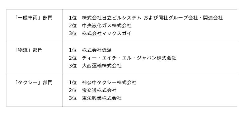 集計方法:2025/4/1~2025/9/30の1,000kmあたりのリスク運転の発生回数が、各部門で最も少ない企業を選定(※公平性担保のため、リスク運転の検出閾値を変更している場合は各社の設定に応じて補正を行います)