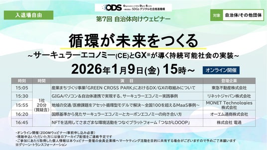 一般社団法人SDGsデジタル社会推進機構(以下「ODS」)は、2026年1月9日に「循環が未来をつくる~サーキュラーエコノミー(CE)とGX※が導く持続可能社会の実装~」をウェビナー形式で開催することをお知らせいたします。