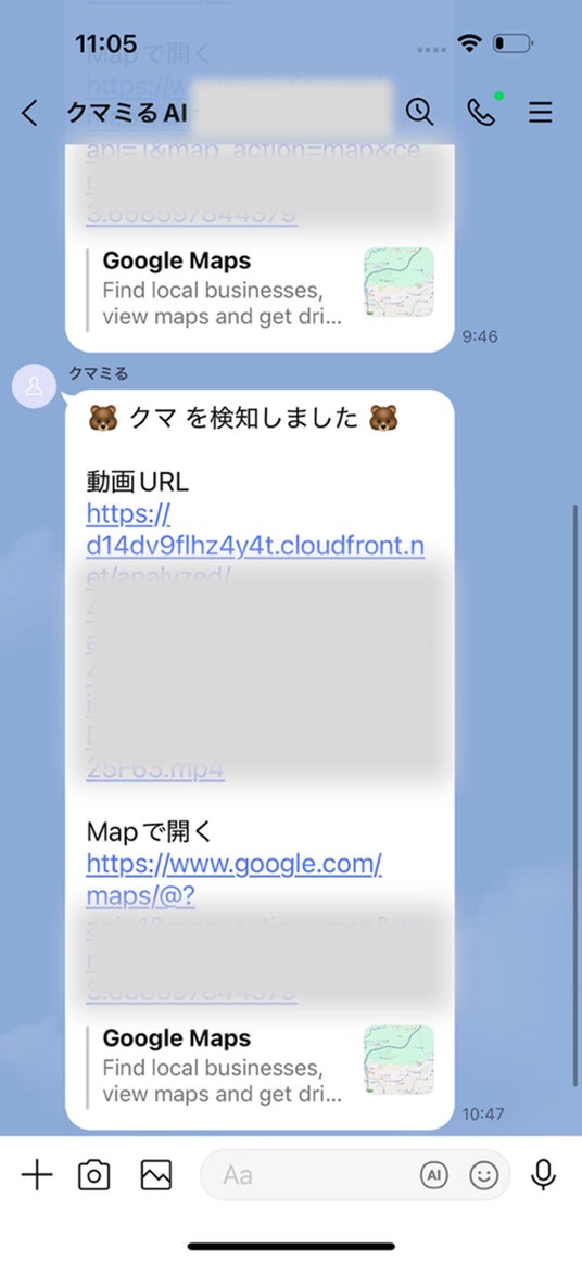 さらに、映像の伝送からAI解析、警報通知までを一貫して確認でき、エンドツーエンドでの連携が有効に機能することを実証しました。クマミるAIがクマを検知した際には、登録されたLINEアカウントへ警報が自動送信される仕組みであり、現場での迅速な対応に寄与します。