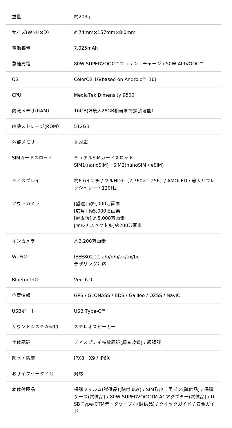 ■OPPO Find X9製品の仕様・スペック