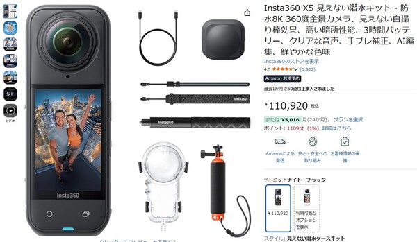 「Insta360 X5見えない潜水キット」の参考価格は110,920円ですが、タイムセールでは17%オフの92,600円という割引価格で手に入ります。
