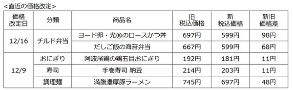 また、先んじて12月9日からは、「阿波尾鶏の鶏五目おにぎり」を192円から181円に、「手巻寿司 納豆」を214円から203円に、「満腹濃厚豚ラーメン」を745円から697円に値下げするなど、定番3品の価格改定も実施しています。