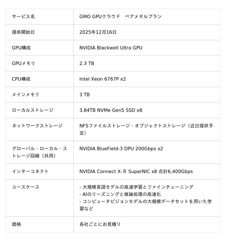 GMOインターネットグループの、GMOインターネット株式会社(代表取締役 社長執行役員:伊藤 正 以下、GMOインターネット)は、NVIDIAテクノロジで構築した高性能GPUクラウドサービス「GMO GPUクラウド」において、「NVIDIA Blackwell Ultra GPU」(URL: https://www.nvidia.com/ja-jp/data-center/technologies/blackwell-architecture/)を搭載した「NVIDIA HGX B300 AI インフラストラクチャ(以下、HGX B300)」を導入したクラウドサービスを、2025年12月16日(火)より国内最速クラスで提供開始いたしました。