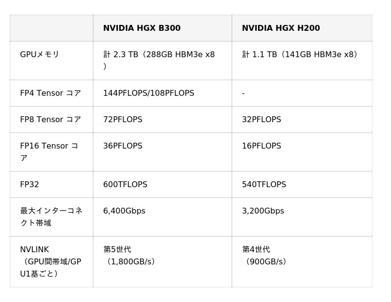 GMOインターネットは、2024年4月15日に経済安全保障推進法に基づく特定重要物資「クラウドプログラム」(※1)の供給確保計画に関する経済産業省の認定を受け、同年11月22日から国内最速クラスでNVIDIA Hopper GPU(https://www.nvidia.com/ja-jp/data-center/h200/)を提供(※2)しています。こうした市場環境や技術的要請を踏まえ、当社は2025年5月14日公表のBlackwellアーキテクチャの最新世代「HGX B300」への切り替えを決定いたしました。